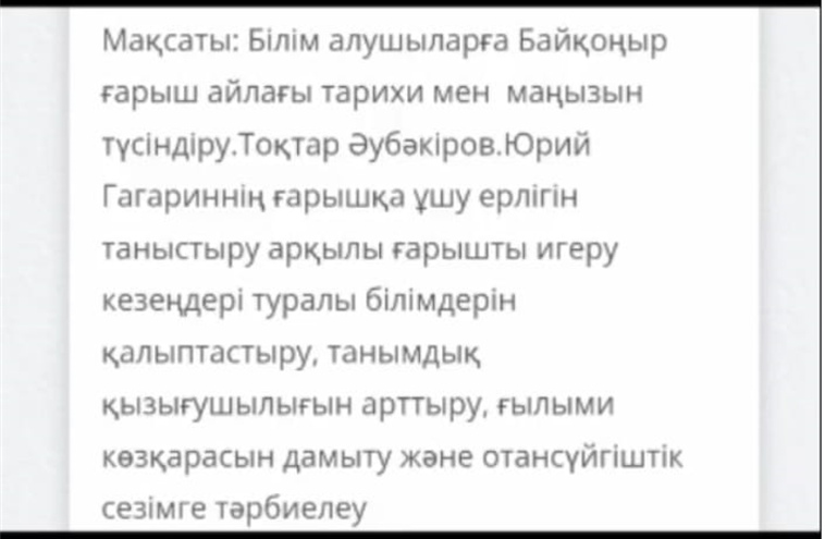 12 сәуір – Ғылым және Космонавтика күніне орай «Ғарыштық технологиялар және болашақ» тақырыбында оқушылармен танымдық сабақ өткізілді. Іс-шараның мақсаты: оқушыларға ғарыш саласындағы жетістіктерді таныстыру, ғылымға деген қызығушылықтарын арттыру және олардың танымдық қабілеттерін дамыту болды.