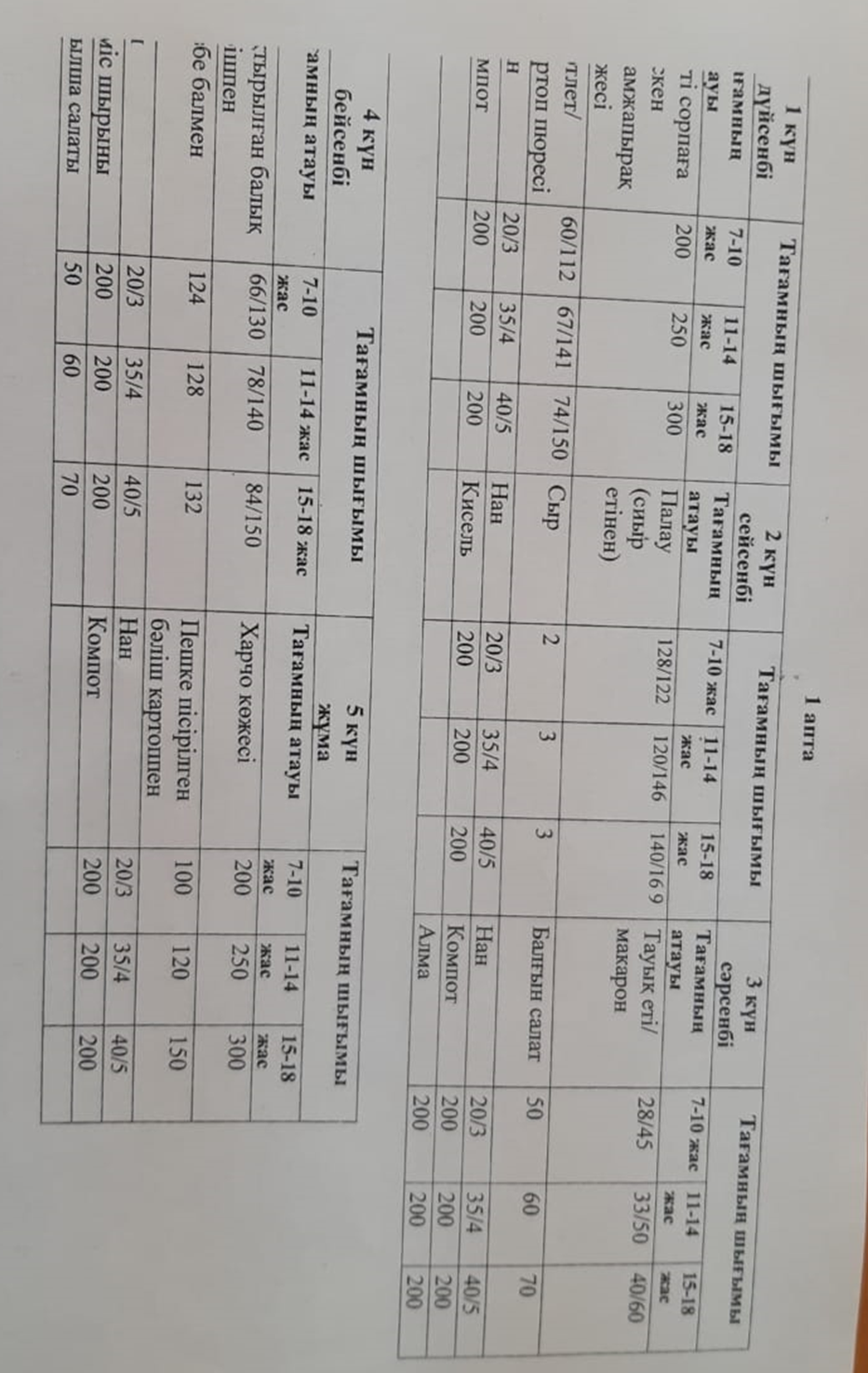 Апта бойынша күнделікті тағамның атауы және шығымы