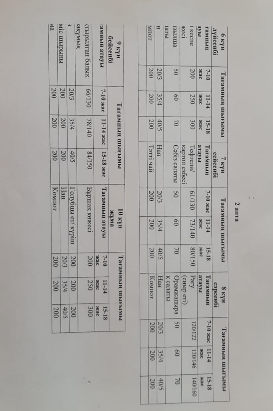 » » Апта бойынша күнделікті тағамның атауы және шығымы