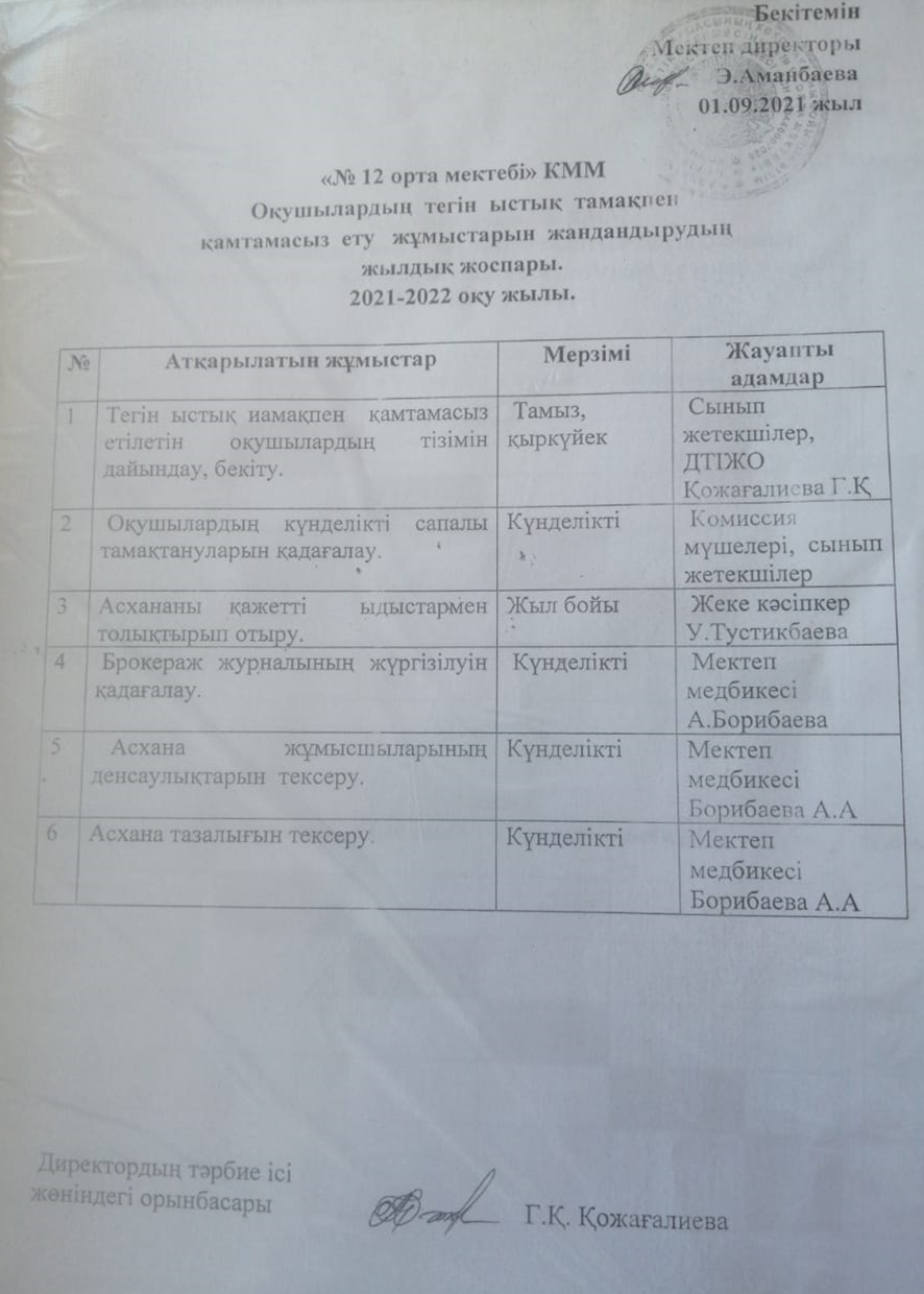 Оқушыларды тегін ыстық тамақпен қамтамасыз ету жылдық жоспары » №12 орта мектебі