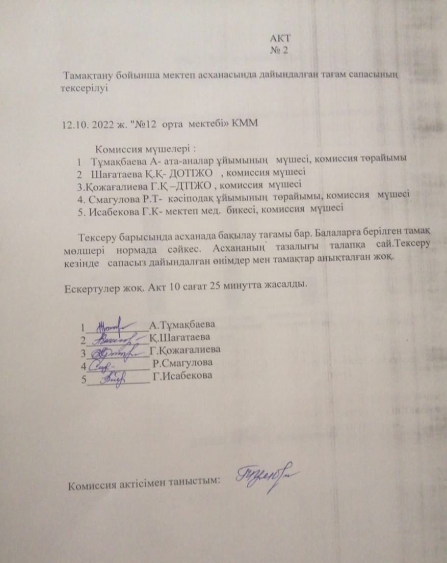 12 октябрь 2022 0 1 2 3 4 5 Тамақтану бойынша мектеп асханасында дайындалған тағам сапасының тексерілуі
